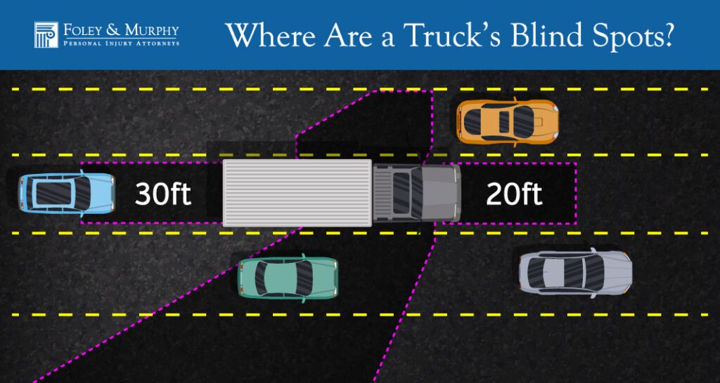 According to the Federal Motor Carrier Safety Administration (FMCSA), semi-trucks have large blind spots.